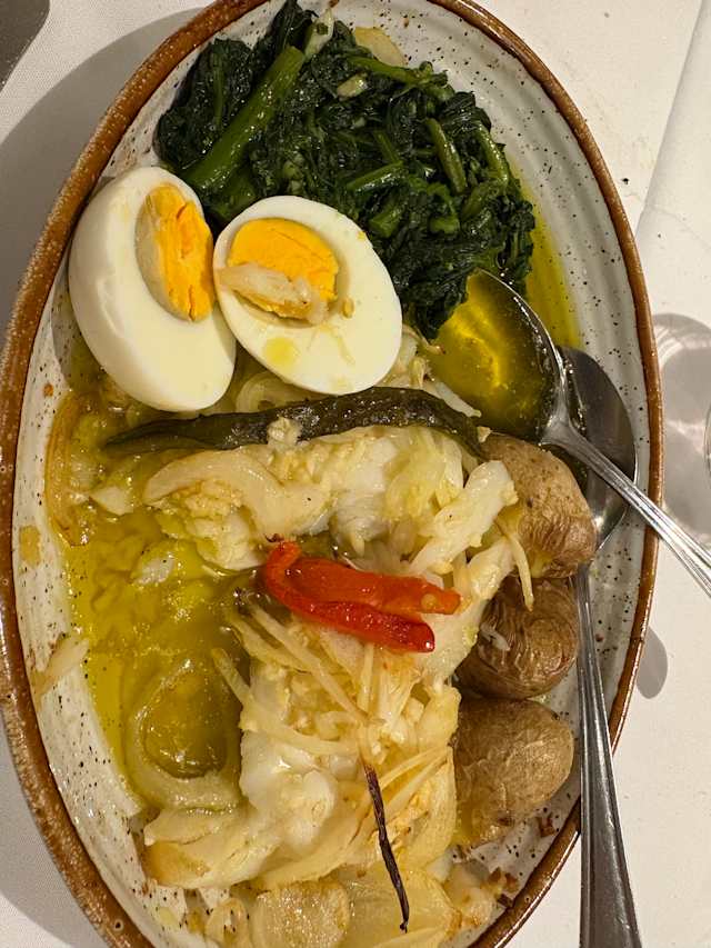 - bacalhau alto assado em posta, batata a murro e verduras salteadas