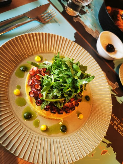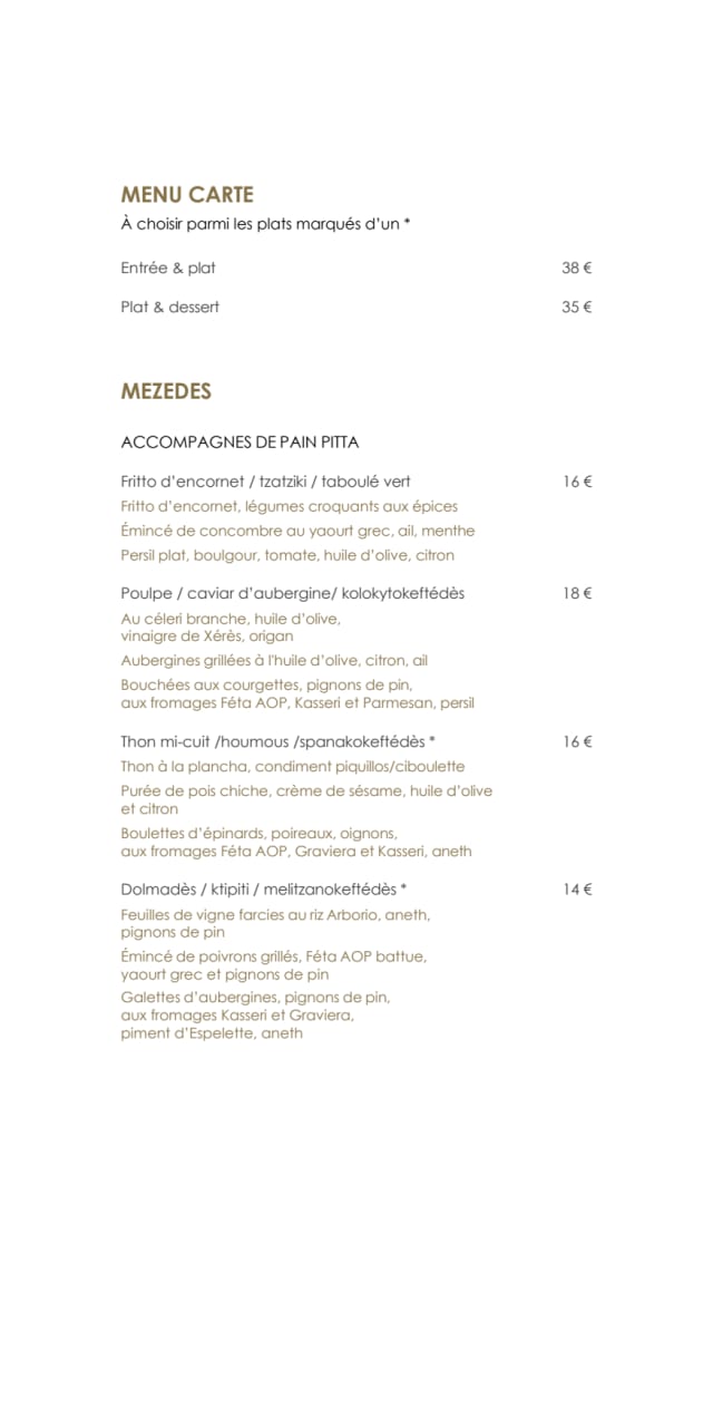 9.5/10Wonderful Mediterranean (mainly Greek) dishes with some creative touches, all made with top-quality products. Reasonable prices considering the taste, quality and portions, as well as the location. Exceptional service that echoes Greek hospitality at its best. A bit too hot and a tad stuffy in the restaurant (at the top floor of the Galeries Lafayette Champs Elysées), but the air function made things better in the course of our lunch. We are looking forward to our next visit!