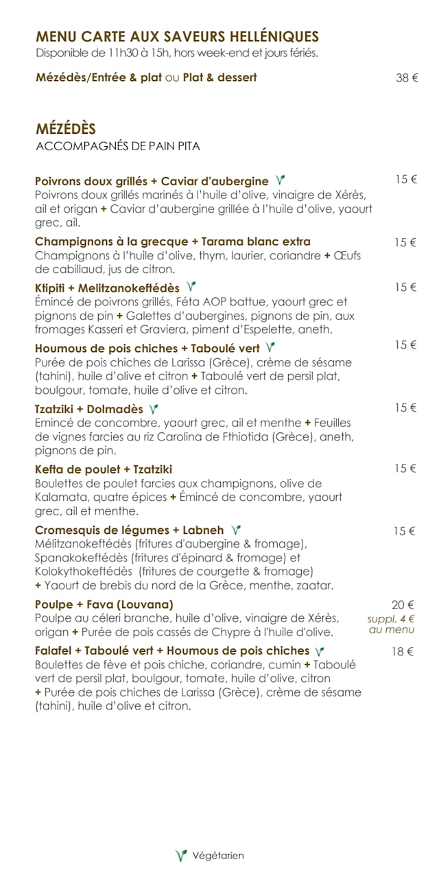 Wonderful Mediterranean (mainly Greek) dishes with some creative touches, all made with top-quality products. Reasonable prices considering the taste, quality and portions, as well as the location. Exceptional service that echoes Greek hospitality at its best. A bit too hot and a tad stuffy in the restaurant (at the top floor of the Galeries Lafayette Champs Elysées), but the air function made things better in the course of our lunch. We are looking forward to our next visit!