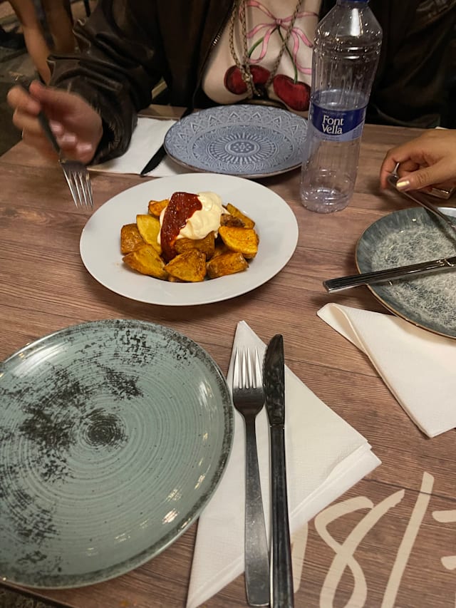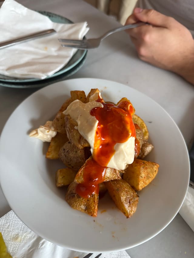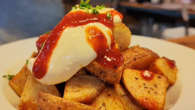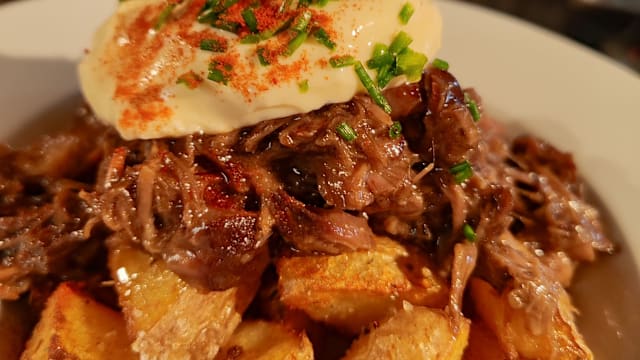 Bravas con carrilleras ibéricas guisadas y desmenuzadas