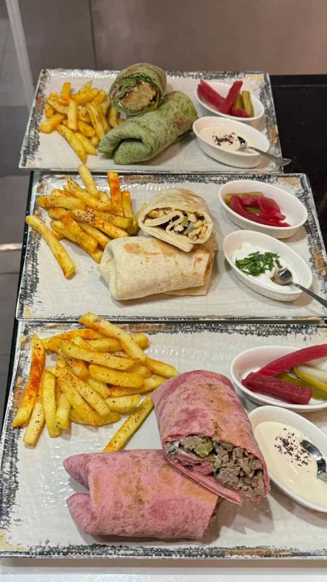 - Shawarma de ternera y verduras en pan plano morado de remolacha. Con patatas.