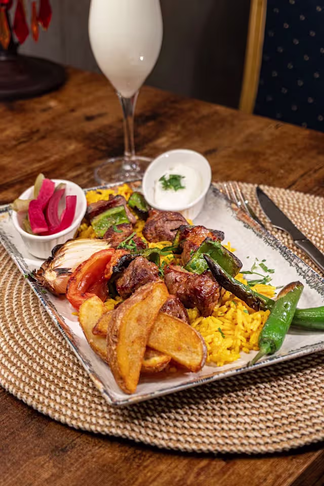 - Dos brochetas de jugosa carne iraquí al carbón, con arroz, verduras y patatas fritas.