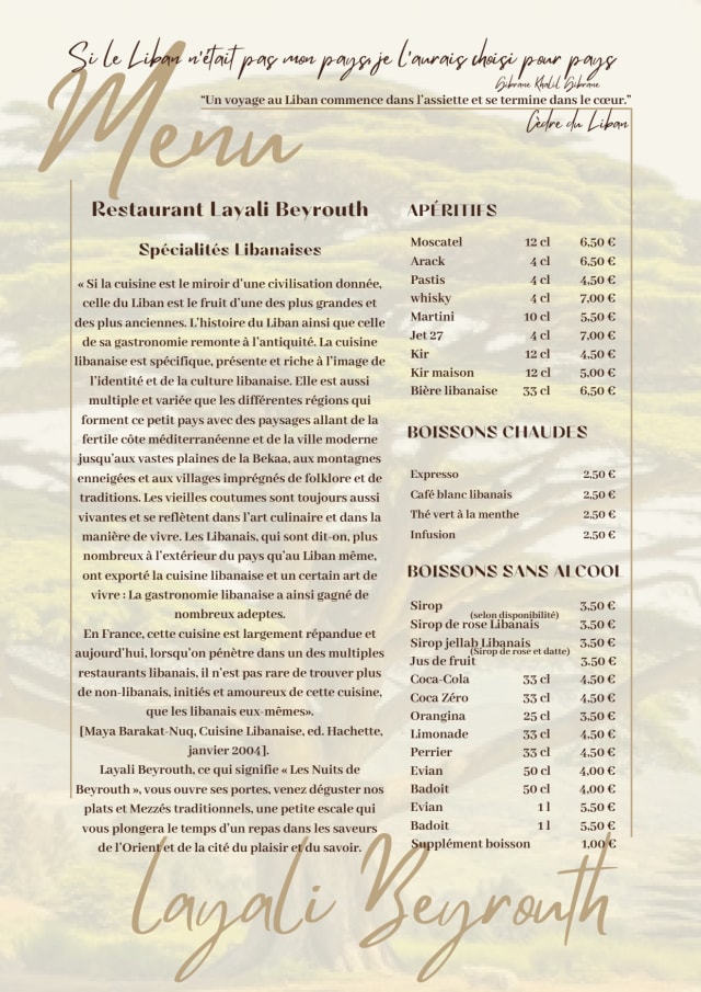 UN LIEU AUTHENTIQUE - Dans un cadre aux tons pourpres et violacés retrouvez toute l'originalité de la culture libanaise et de sa cuisine, une ambiance chaleureuse et accueillante pour un dépaysement garanti. UNE CUISINE HAUTE EN SAVEURS – Le Chef vous proposera des plats typiques, frais et sains,...
