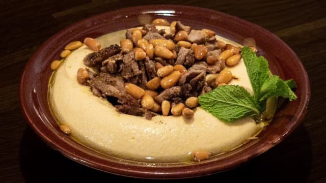Crema de garbanzos con una isla de tierno shawarma de pollo