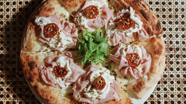 - Fior di latte, mortadella favola, granella di pistacchio, burrata d'Andria.