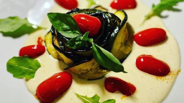Crêpes con fonduta di pecorino, zucchine gratinate e pomodorino confit