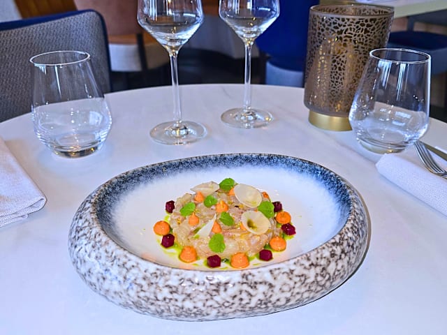 - La Gambas rôties cerfeuil tubéreux , bisque, panais crémeux , tartelette de gambas