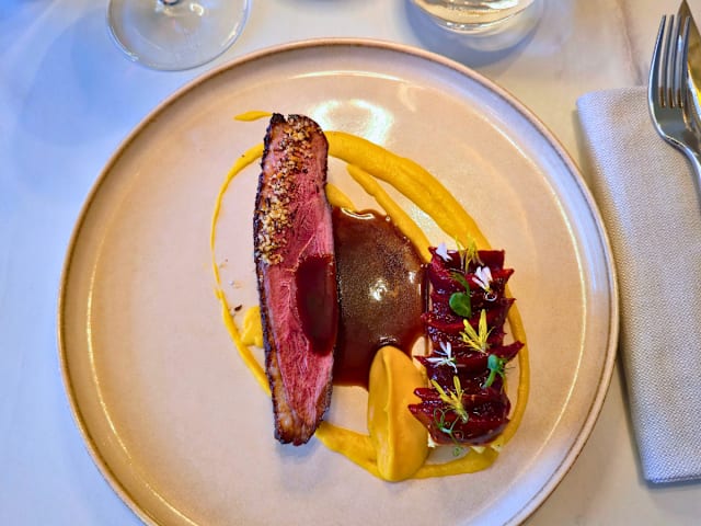 - Filet de Canette, patate douce fumée, rillette laquée, sauce griotte