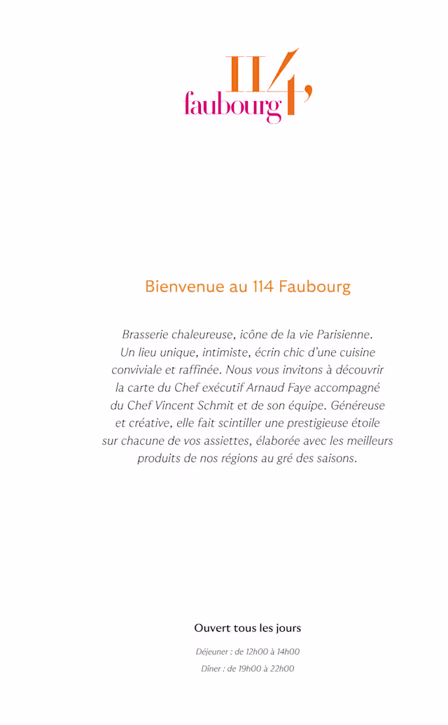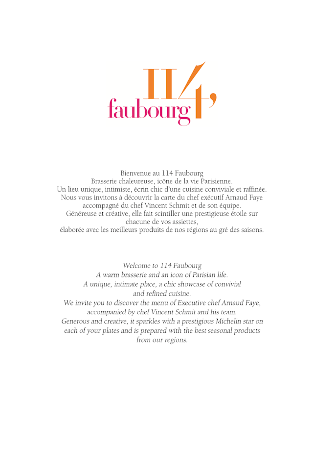 3.5/10Little went well - the menu to choose from was very limited, food combination were strange and the starter I ordered was disgusting. Service was very slow - we waited for 20 minutes before our orders were taken. We were thoroughly disappointed - 114 Faubourg does not deserve its Michelin star!