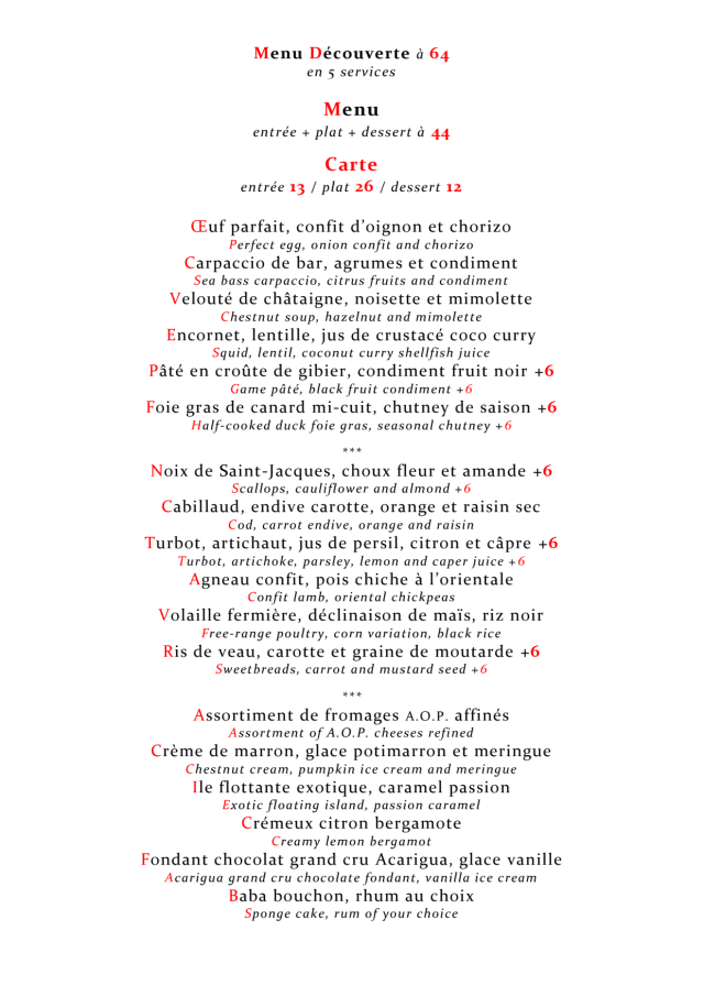 Thank you for your comment, unfortunately you did not indicate your desire to have menus in English, even your head waiter that evening is himself English. For the dishes they are what they are in any case they are as we wanted them to be served! For the price it is displayed in large: 44 euros. Good Parisian discoveries...