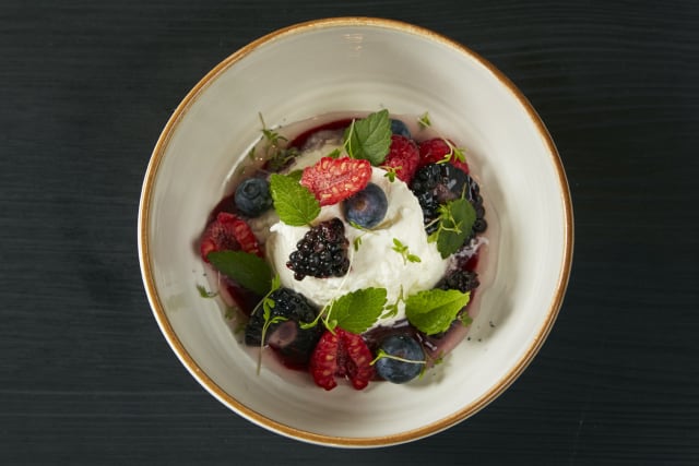 - Poire pochée au vin rouge, crémeux vanille et crumble de noisettes présentée dans son verre à vin