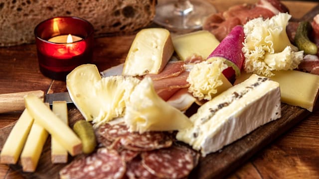 Brie truffé maison, gouda à la truffe, tête de moine, cantal entre-deux jambon de pays grande réserve (24 mois), lomo traditionnel, jambon blanc truffé.