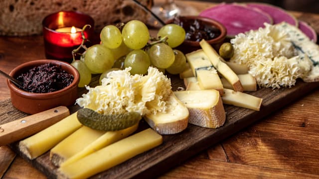 Comté 16 mois, saint-nectaire fermier, beaufort, morbier, bleu d’auvergne, cantal entre-deux, deux accompagnements de saison.