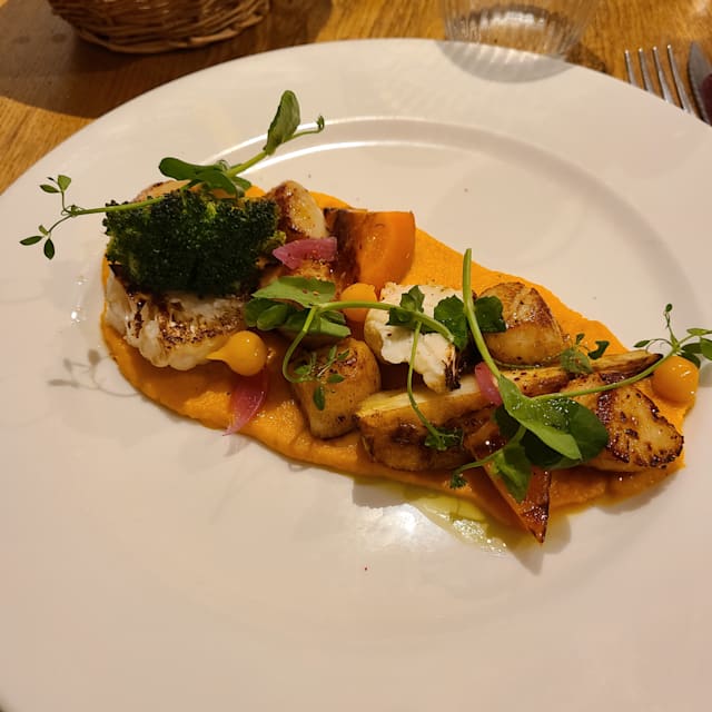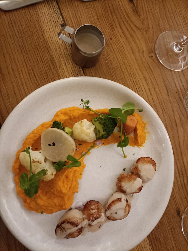 Noix de st jacque poelee, purée de panai et sa reduction de coraille