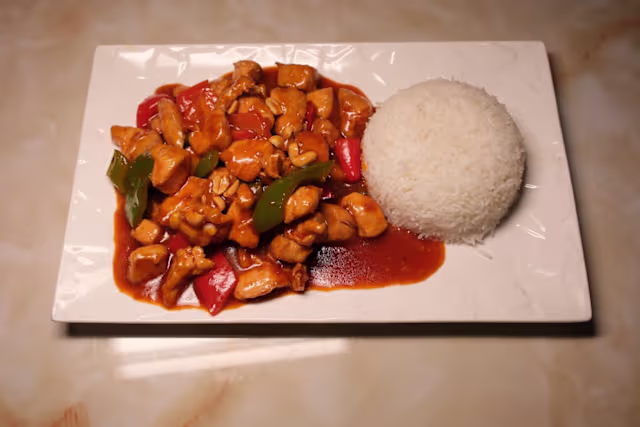 - Dés de poulet, fruits secs et poivrons sautés dans une sauce sucré-salé.
