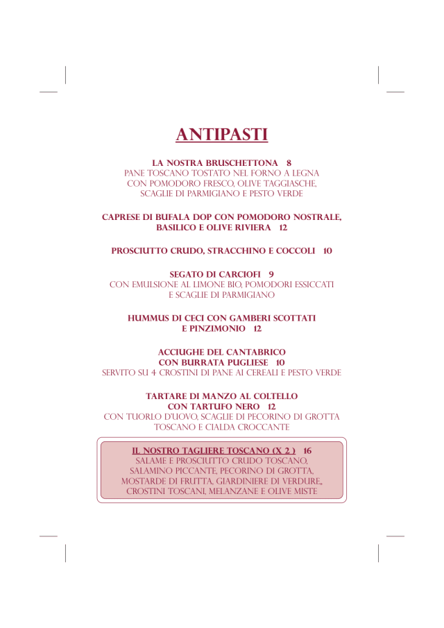 10/10Excellent food and atmosphere! We eat dinner here at least twice on every trip to Florence. Marco is an outstanding waiter!
