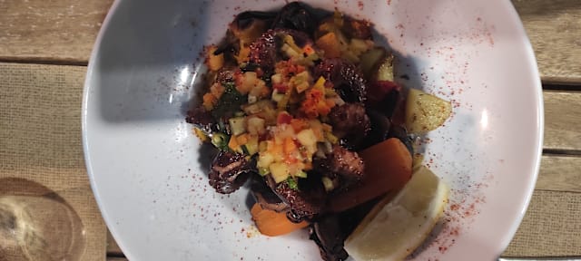 Poulpe à la plancha accompagné de risotto courgette basilic et ses légumes rôties.
