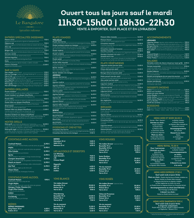 10/10We enjoyed our meal at Bangalore. The butter chicken and chicken tikka masala were excellent, as was the wine. Great service and a lovely ambiance. We will definitely be back to try more of the menu!!