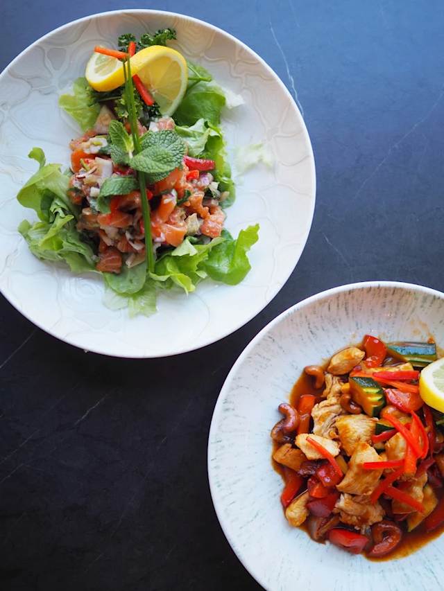 - Salade tiède composée de fines vermicelles, de crudité, d’émincé de boeuf sauté au curry, lait de coco & son nems au poulet