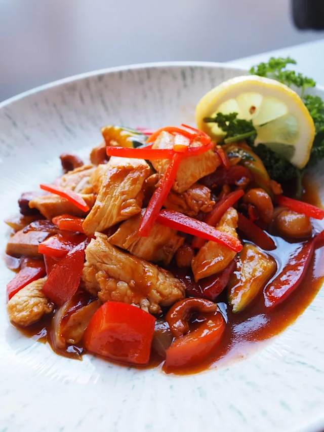 - Crevettes sautées à l’ananas, tomates cerises & sauce aigre douce