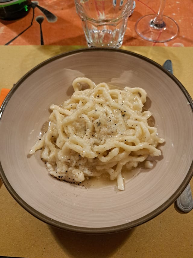 8.5/10Lovely friendly waitress. Very good location just off the main square. We sat outside under the large canopy but you could sit inside if preferred. A good choice of Tuscan food we had a lovely selection of bread and assiette of cheese to start followed by tagliatelle and gnocchi. The some tiramisu for food measure. The wine was very good also. Would recommend. Simple pleasures. 57E for two including a full (good) bottle of wine and sparkling water.