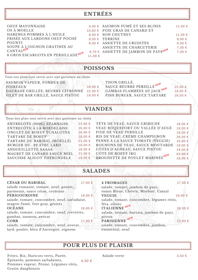 If you plan to eat at Le Baribal, the average price should be around €25. The average price is calculated based on appetizer/entrée or entrée/dessert, excluding drinks. Prices have been provided by the restaurant.