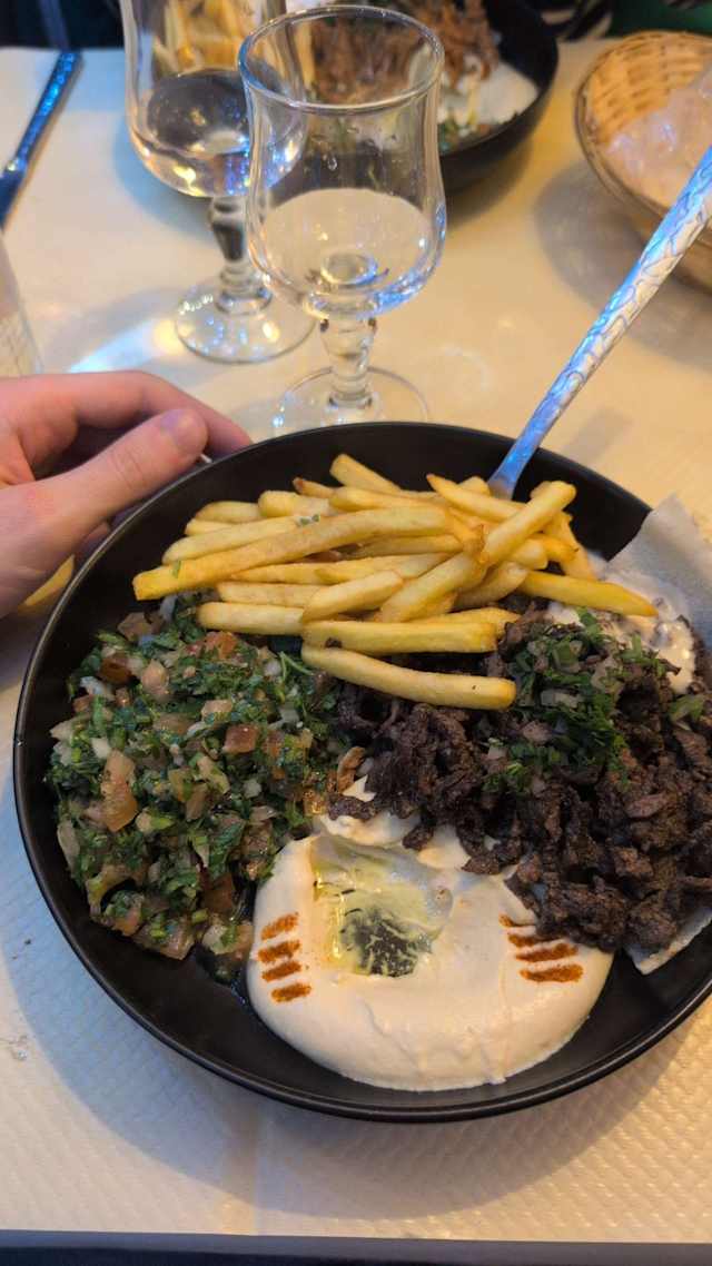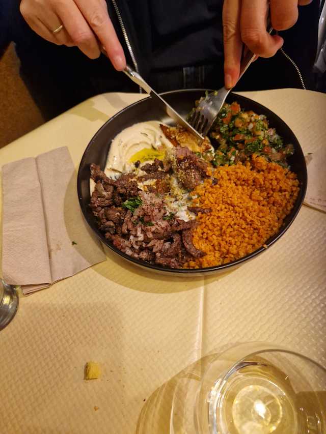 - composé de hommos, moutabal, taboulé, moussaka, fatayer, falafel, blé concassé et au choix une viande