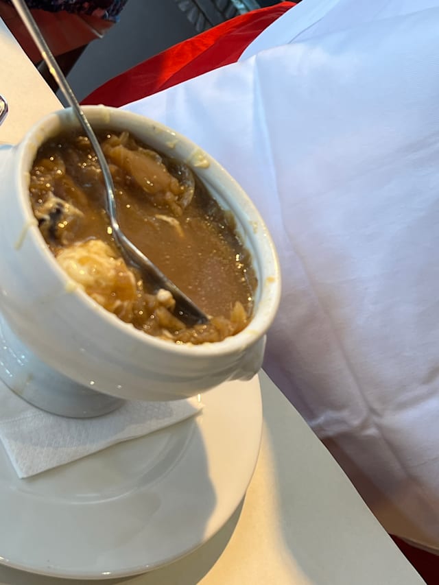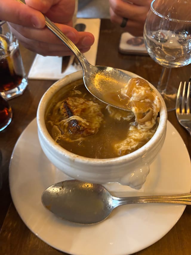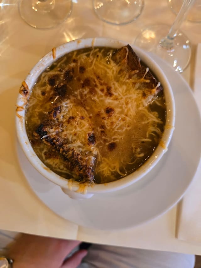 8.5/10French onion soup was good and food was served hot. Flavor was lacking a bit.