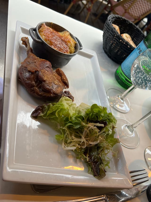 10/10The skin on the duck confit was crispy and the meat succulent. Paired with the au gratin and the red wine. Splendid! Topped it off with crème brûlée. Will return again and again. Tres bien, Recommend!!
