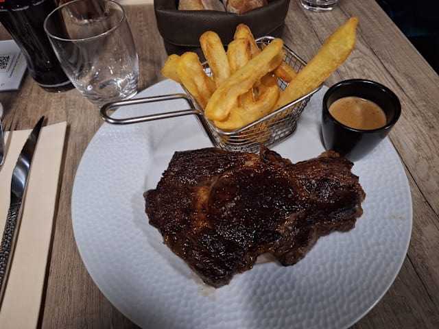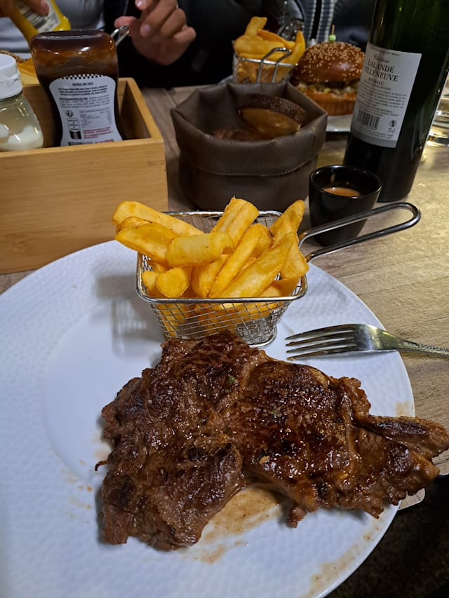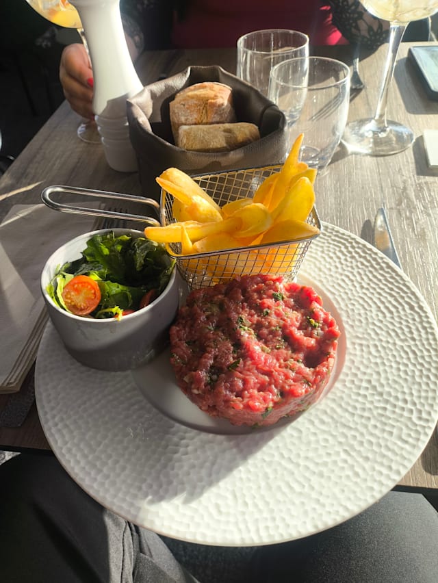 6/10If you’re visiting the Eiffel Tower and looking for a convenient place nearby to grab a bite and a glass of wine, Le Bistro Parisien is a solid option. Located just steps from the tower, right by the river and the boat tour docks, it offers a lovely view of the Eiffel Tower—especially in the evening. We made an 8pm reservation and were seated promptly. The outdoor seating is quite tight, with tables very close together, so don’t expect much privacy or space. The menu is fairly limited, with only a handful of options. We ordered the salmon but were told substitutions (like swapping zucchini for mashed potatoes) weren’t possible. The burger and fries were fine, and the kids’ chicken breast and pasta with cheese sauce were okay, though our kids didn’t love them. Service was a bit slow—understandably so, as it looked like there was only one waiter handling all the outdoor tables. As for drinks, the mojito and Moscow mule were just average- presentation and flavor could be better.