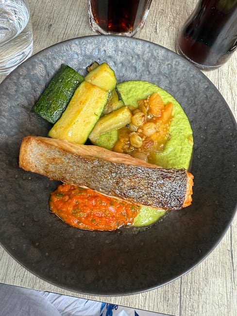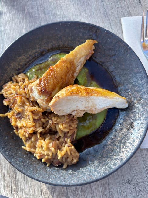 3.5/10Waiter was nice , our wine glasses were different than everyone else's and we had ordered bottled wine not by the glass. Our glassware were tiny. We were not offered water and had to request it. The food came out minus one of our guests meals, the food was cold and overcooked. Our food was taken back to be remade, missing meal arrived simultaneously. When food came back they had just reheated it, which made the overcooked fish even worse, the steak was inedible and unable to cut. Pretty view but not a place I would recommend for food at all.
