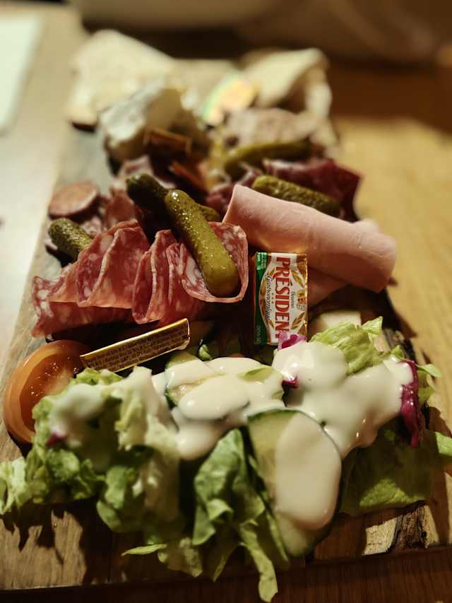 - Charcuteries et fromages - coppa, jambon speck, jambon persillé, saucisse sèche, maroilles, rollot, tomme noire - pour 1 personne. Accompagnements de nos planches : cornichons, pain, beurre