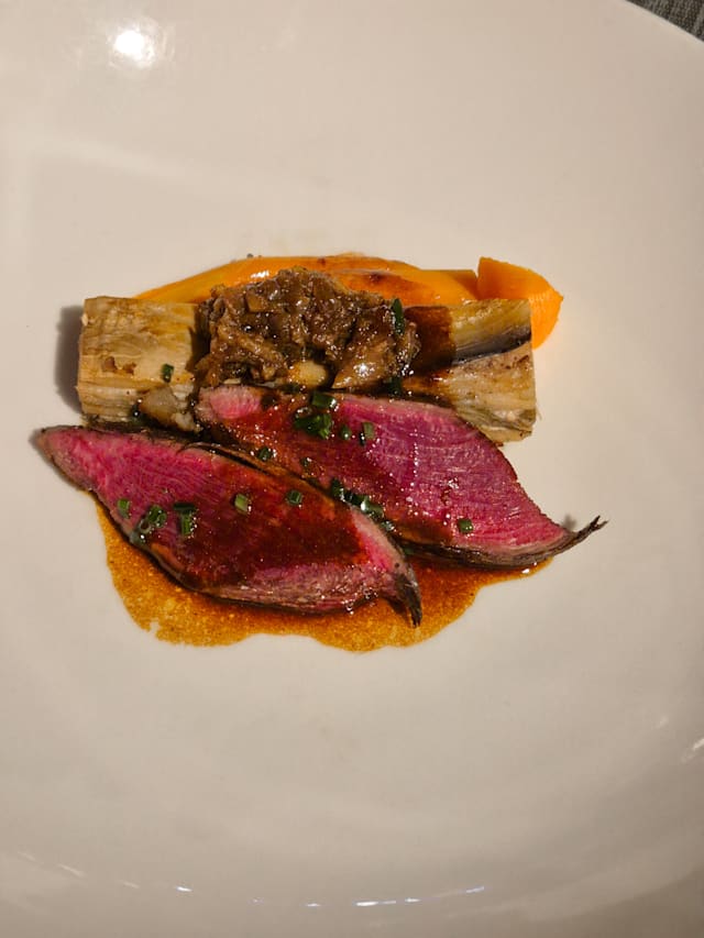 La petite échine de porc confite puis snackée, jus corsé et garniture de saison