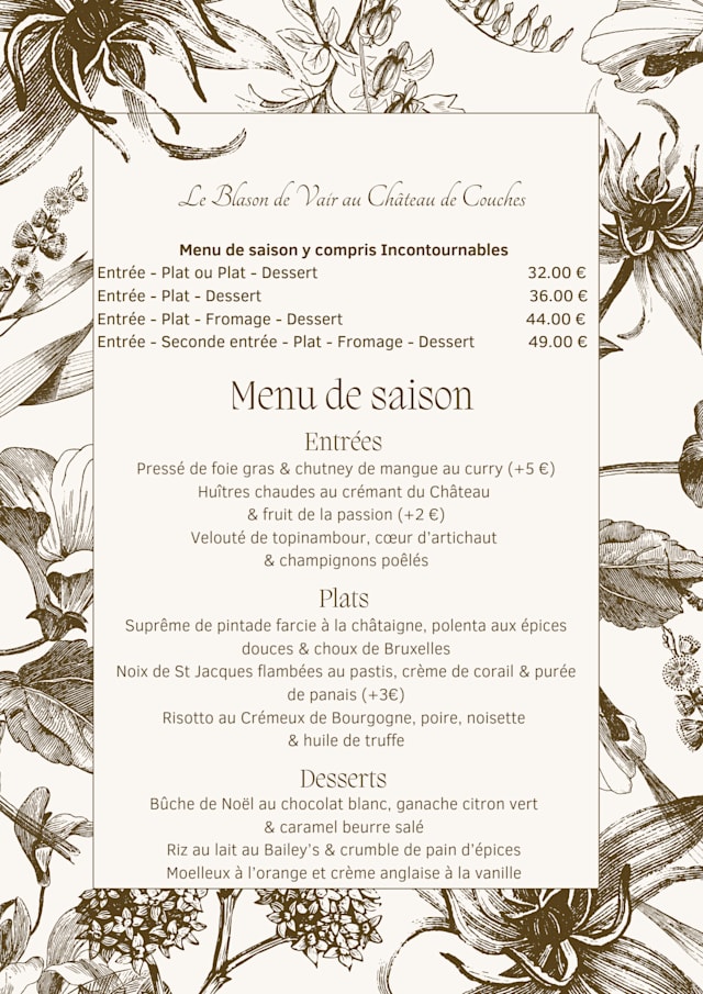 10/10Excellent restaurant in fabulous setting. The food was exceptional and the local wine selection very reasonably priced. At 60 euros a head for 3 outstanding courses plus amuse bouches, coffee and petits fours and wine it was the best value meal so far on our Burgundy trip. And also the most enjoyable.