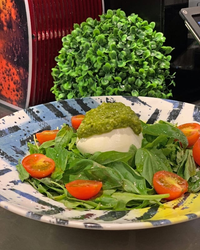Buffalo milk burrata with arugula, basil, pesto and cherry tomato.