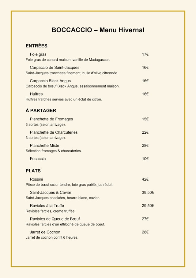 10/10The food was delicious and the server was super helpful and attentive. I ordered the pasta with truffles and they did not skimp on the truffles. My mom had the carbonara, which as rich and delicious. Highly recommend when you’re ready for some Italian food after so much rich French food.