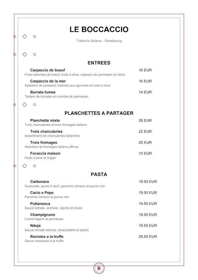 Le BoccaccioVos enfants insupportable à souhait qui regardaient des vidéo volume maximum dérangeant nos autres clients présent. Vous n'avez pas aimé votre plat, ce n'est donc pas a moi de vous l'offrir. La prochaine fois le McDo sera plus adapté à votre situation.