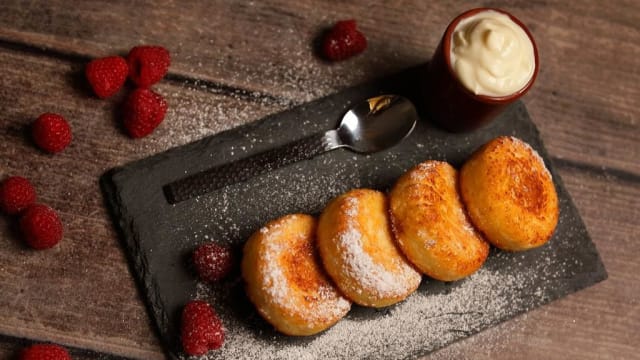 Similaire à des raviolis, capendant plus volumineux, et sucrée. Servie avec ça crème fraiche au choix : Griotte, ou fromage sucrée