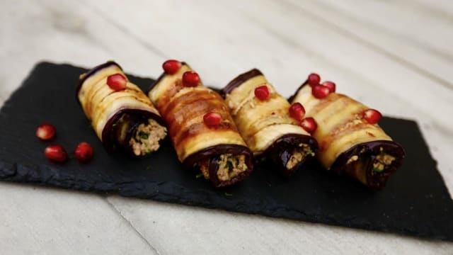 Rouleaux d’aubergine à la pâte de noix, coriandre et grains de grenade