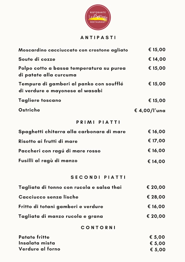10/10Our cruise ship (Viking) gave us two days in Livorno and so we asked Bing AI what would be a memorable and delicious restaurant in Livorno. From among several options, we chose Le Botteghe. It was an easy walk from the center of the city and we had lunch outside next to a canal. It's hard to decide which was better - the gorgeous scenery or the delicious food. It was a tie. We had a wonderful Caprese salad, and delicious pasta and wine. I've said many times that our lunch at Le Botteghe was easily the highlight of a wonderful trip. Don't overlook this place. It's a gem.