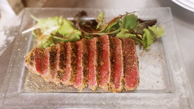 Tagliata di tonno con farina di pistacchio e crema di verdure alla curcuma