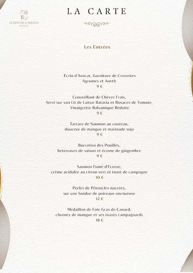 Bonjour Emmanuelle, Merci pour votre retour qui nous ravit ! Nous sommes contents d'apprendre que votre expérience au sein de notre restaurant français à Vincennes a été à la hauteur de vos attentes. Votre satisfaction est une belle récompense. Au plaisir de vous retrouver au Bouche à Oreille pour d'autres instants gourmands. L'équipe du Bouche à Oreille