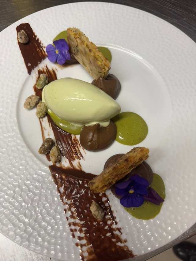 - Pêche de Vigne Pochée au Pinot Noir D'Alsace et Épices Douces, Crème Glacée au Lait Ribot Citronnée, Pralines de Pistaches