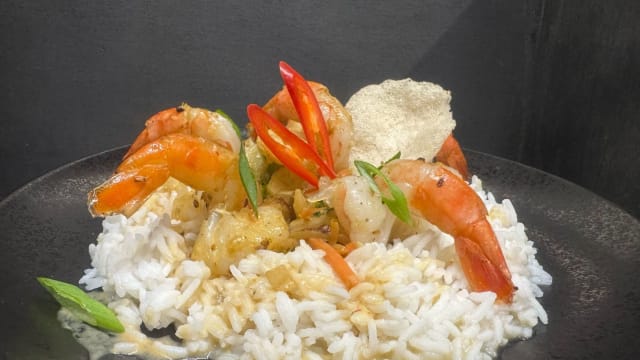 Queues de crevettes lait de coco, curry rouge, gingembre et citronnelle, riz basmati et légumes