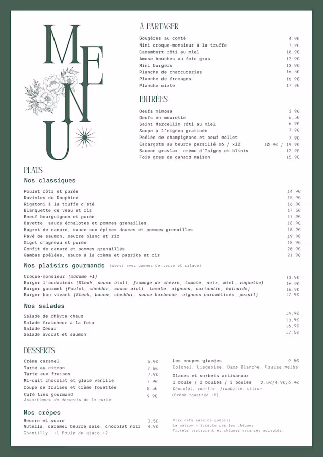 The food was fantastic. I ordered a Megret de canard, it was out of this world. We had also some foie gras which was great too. All very well priced. Nice ambiance as well. I recommend 100%.