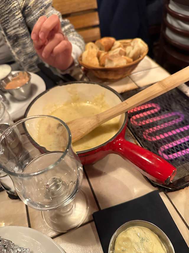 6/10location is fine in a nice neighborhood. the cheese fondue does not taste "normal", too "thick", felt like something was added to it. here comes the real problem: the charcuterie (porc stuff) plate is really Bad quality for around 20 euros. the potatoe was not pleasant, my son did not want to finish it. Room for improvement to say the least