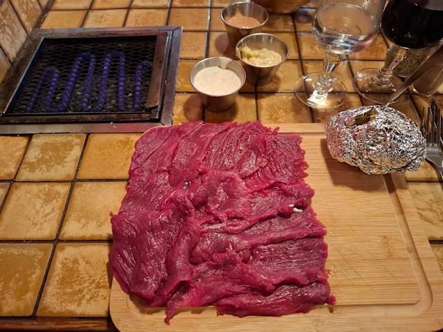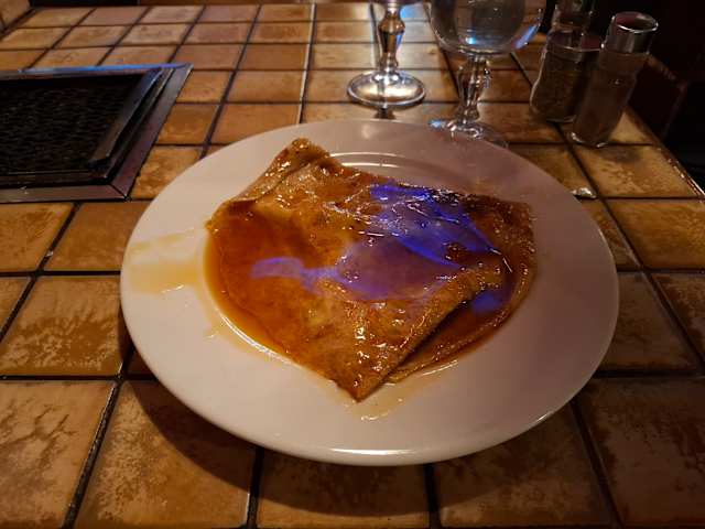 - Crêpe Sarrazin, pommes de terre, fromage à raclette, emmental, jambon cru, cornichons, oignons confits, crème fraîche isigny