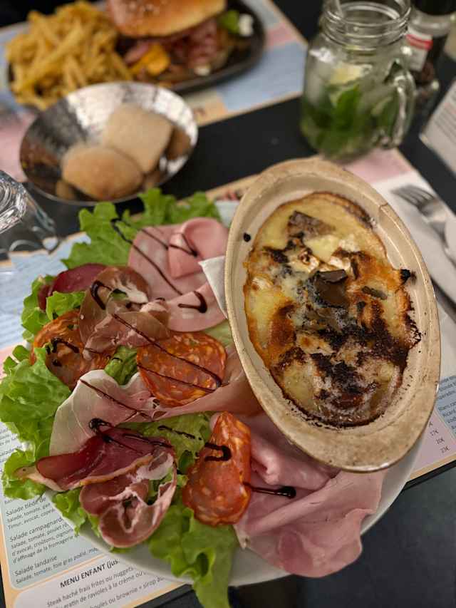 - Bun artisanal, beaufort d’été (de la fromagerie « au poivre d’âne »), jambon cru, steak haché frais, rösti de pomme de terre, salade, tomate, sauce burger