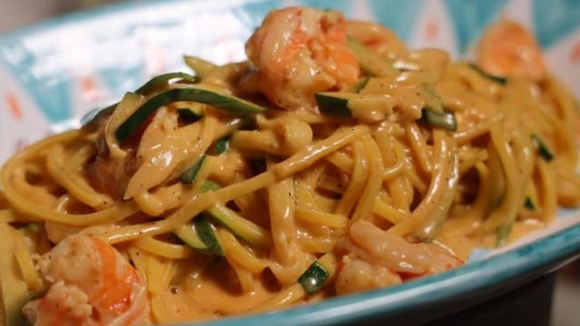 Impasto con un gusto piccante con zucchine, mazzancolle, pachino e vodka
