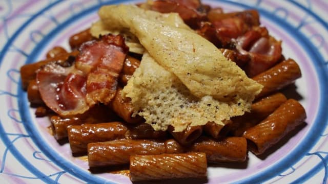Prosciutto crudo, peperoni e radicchio mantecati con un pizzico di panna, parmigiano
